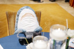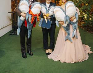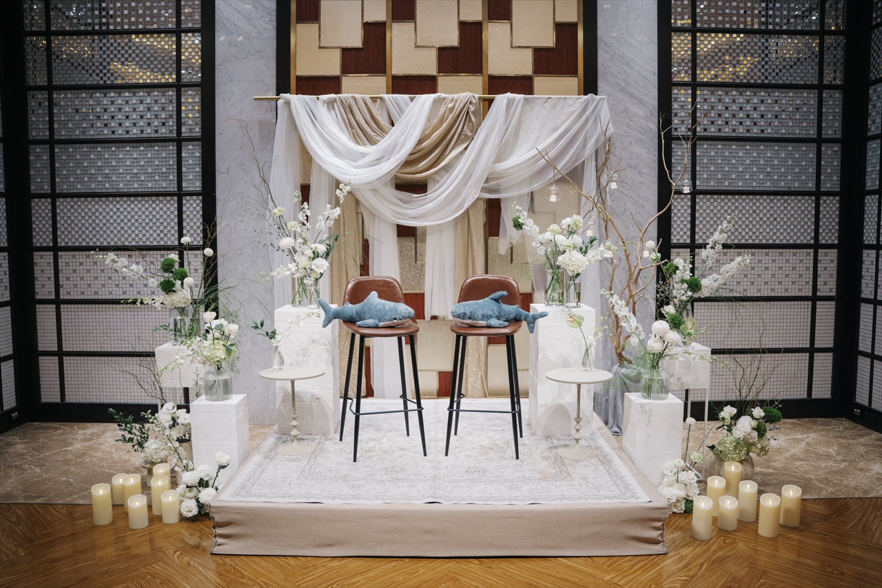 ふたりが座る高砂には2匹のサメのぬいぐるみがが...🦈
