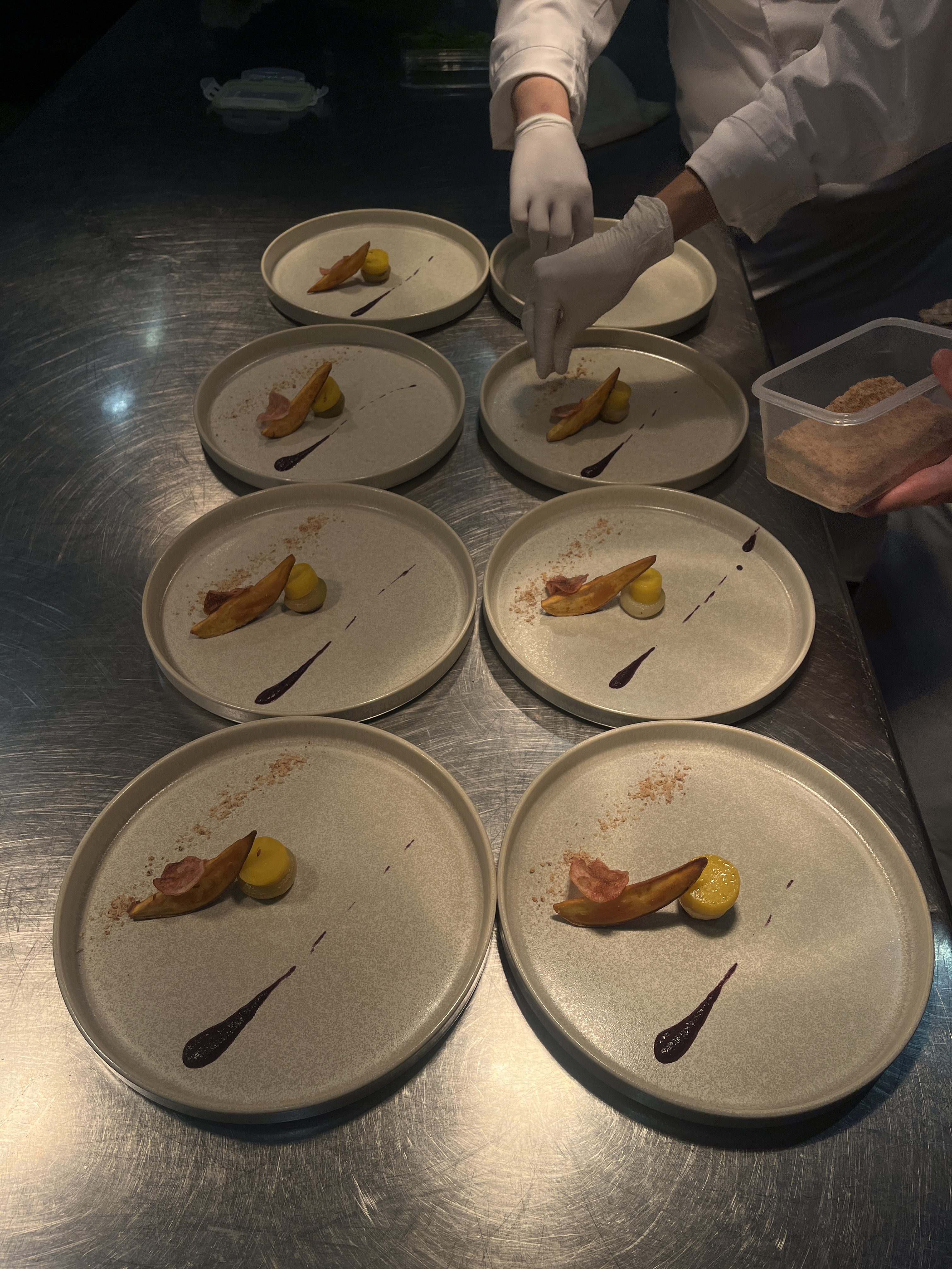 一皿には何種類もの食材が異なる調理法で彩りよく並びます 食材一つ一つのビジュアル 角度 食材の状態 を確認しながら丁寧に。丁寧に。想いを込めて盛り付けています お客様に最高なタイミングで完璧な状態のお料理を提供できるよう厨房スタッフ全員が一つのお料理に集中して作り上げています!!
